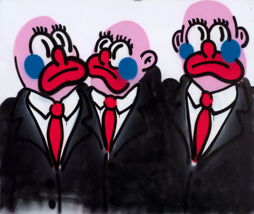 He took that lesson to heart. During the lockdown in 2020, Slawn began to paint, populating his works with a recurring face that played with racist blackface caricatures. This signature image became a hallmark of his style, seen in works like Three Arthurs, which features three such figures in suits or across each of the 1,000 colorful canvases at Saatchi Yates. “I say this in the most honest way, that is all I know how to draw,” he confessed.