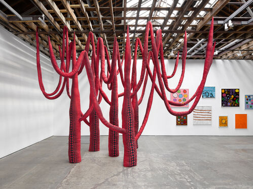 For example, on view is Death of Nerves (2022), a large-scale sculptural installation made from multicolored sewn and stuffed fabric elements, originally commissioned by M+ Museum in Hong Kong. Alongside that installation, a new series of paintings fills the gallery’s first floor, hung in salon style and bursting with bold colors and imagery exemplary of the artist’s oeuvre, such as her dot-covered “Infinity Nets.”
