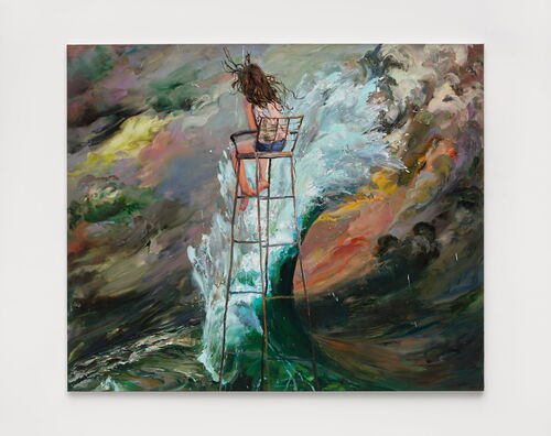 In Island of Expectation (2023), for example, a single female figure is balanced precariously upon a ladder above a wide and wild sea, the turbulent, churning waters acting as a metaphor for her innermost feelings. Meanwhile, in Island of Survival (2023), the swirling clouds that envelop the sky mirror the tension between the central figures beneath.
