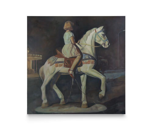 Featuring a selection of haunting, closely cropped, hyperrealistic new paintings, the exhibition sees Wang continue his investigations into the relationship between imagery and digital consumption. Rejecting the digestible clarity of clickbait, the works on show are deliberately cryptic and often provoke more questions than they answer. One, a moody rendering of a merry-go-round surrounded by darkness, The Vanity Fair (2024), is akin to a still from a horror film—the viewer is left on edge, wondering what might happen next.