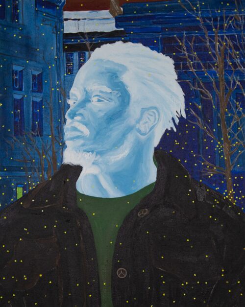 This color choice attests to the artist’s own experience of racial malaise as a Nigerian man studying in America (he graduated with an MFA from the Rhode Island School of Design earlier this year). This chromatic alternative at once references the photographic negative—in which the lightest areas of the photographed subject appear darkest—and the roiling negative bias Black people face in America. The canvas Higher Goals (After Hammons) (2024) is a self-portrait referencing Black American artist David Hammons’s Higher Goals (1986), a public sculpture work that featured colossally towering telephone poles mounted with basketball backboards.