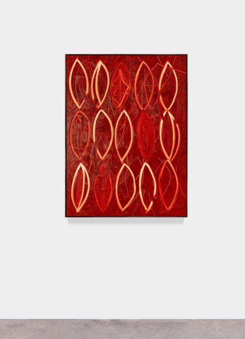 In the paintings on view, Johnson’s color spectrum volleys from reds to blues, creams to browns, while also employing materials with charged racial histories such as shea butter and black soap. Looming large over the show is Kevin Quashie’s 2012 book The Sovereignty of Quiet, which discusses how “concepts like surrender, dreaming, and waiting can remind us of the wealth of Black humanity.” The show is also filled with a recurring abstract form: the almond-shaped vesica piscis (two intersecting discs).