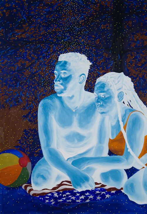 Nigerian artist Boluwatife Oyediran debuted with a solo exhibition at AFIKARIS two years ago (“Point of Correction”), creating imagery overturning white patriarchal tropes. Now, “Inverted Blackness” features portraits of Black immigrants living in the United States, their skin articulated in shades of blue.