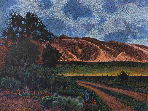 For those familiar with Van Gogh, Begay appears to share a visual lexicon with the Post-Impressionists—evocative color palettes, textured landscapes, and densely patterned portraits. However, the artist connects these techniques to a broader history outside the Western art canon. “People have been doing this broken-stroke art for centuries. Look at the aboriginal spiritual work from Australia,” he told Canyon Road Arts.