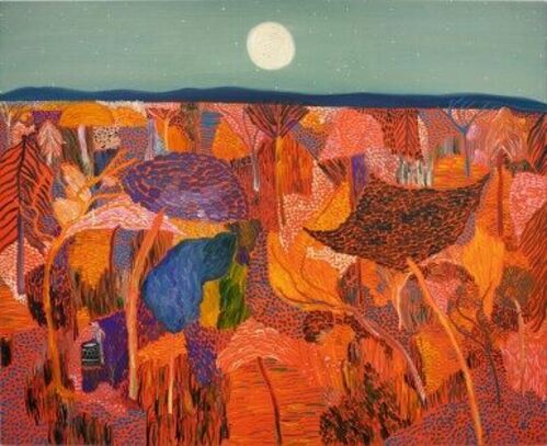 Wong often employed sharp contrasts in color—dark skies against florid forests, or dark blue skyscapes speckled by yellow stars. The Realm of Appearances (2018), for instance, where the moon sits above a red-clad forest scene, is typical of Wong’s dense, textured landscapes with energetic markmaking and impasto techniques.