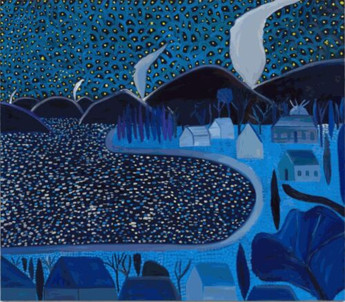 In Canadian artist Matthew Wong’s Starry Night (2019), the late Canadian artist depicted a blue-toned landscape where a lakeside town sits under a star-speckled sky. But instead of Van Gogh’s swirling stars, Wong dotted the sky with a scale-like pattern pierced by bright yellow dots.