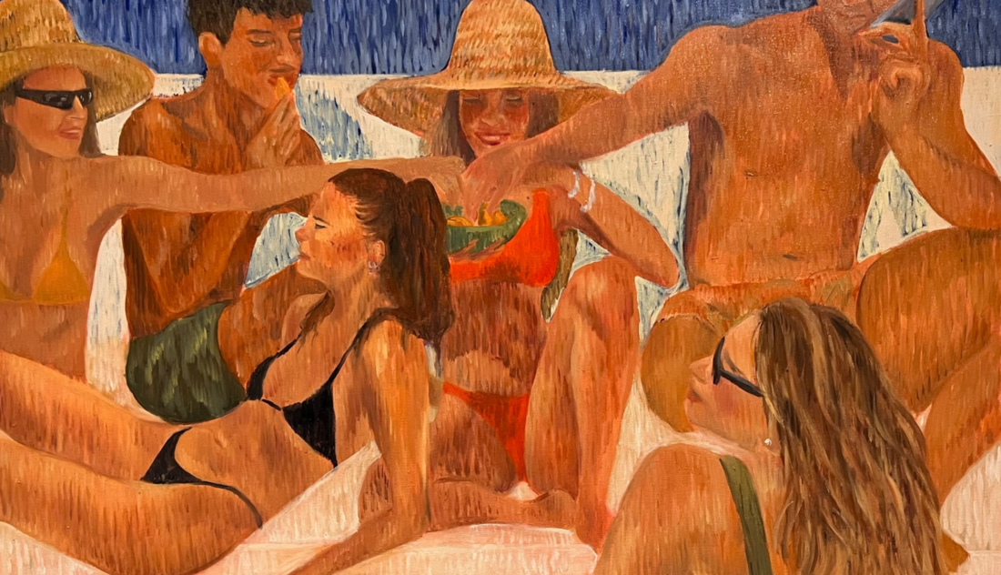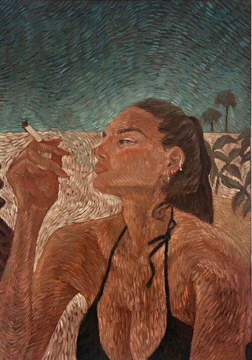 The resemblance to Van Gogh’s portraiture is particularly evident in Post Sun (2024): showing a friend, depicted in profile, smoking a cigarette in Morocco. The portrait is ornamented by daubs of white paint that create a flowing pattern emanating from the figure, reminiscent of Van Gogh’s blue Self-Portrait (1889). Meanwhile, in Bowl of Citrus on a Balcony Ledge (2024), the swirling brushstrokes and bright oranges recall Van Gogh’s still lifes, particularly Still Life with Basket and Six Oranges (1888). These works were featured in Cochrane’s solo exhibition “It Won’t Last Forever” at Gillian Jason Gallery in September 2024.