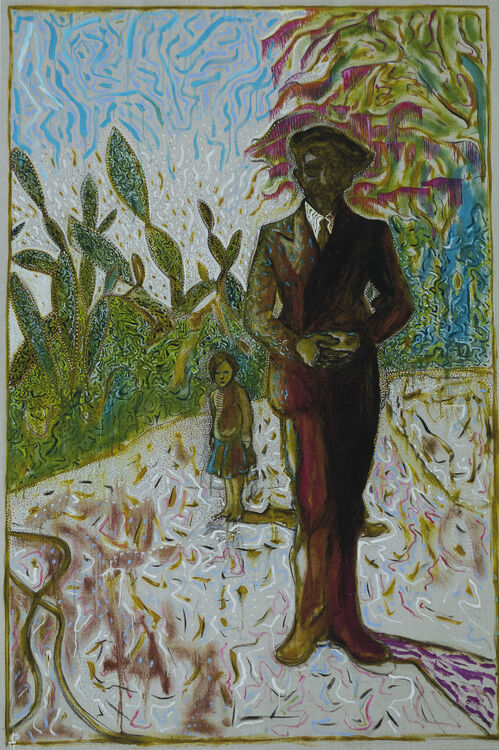 A fisherman alone on a boat, a self-portrait with his daughter, or an empty forest: Childish often paints scenes of rural life, evocative of the work Van Gogh completed in Arles. Amongst Cactus (2013), a portrait of Childish and his daughter in the desert, is defined by heavy, erratic lines and kaleidoscopic colors, akin to Van Gogh’s alleged last painting, Tree Roots (1890).