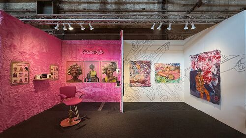 For the gallery’s Atlanta debut, Residency Art Gallery presented a double exhibition of Atlanta-based painter Kirk Henriques and Los Angeles–based performance artist Autumn Breon. On the right side of the booth, Henriques’s paintings on fiberglass mesh, priced from $8,500 to $14,500, focus on the relationship between Black men and cars. Meanwhile, on the left side of the booth—arguably the most photographable of the fair—Breon creates an immersive experience of a salon designed with pink walls and a bright pink salon chair in the center. Her works include sculptures such as hair product jars for $250 each and inkjet prints of the artist with rollers curling her dyed-pink hair, each for $2,800.