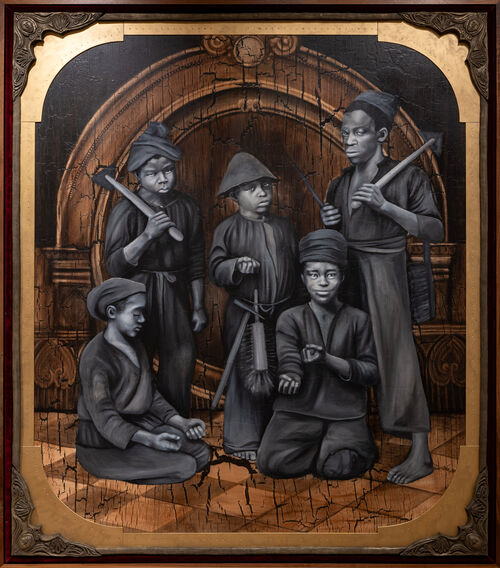 The standout selections at the gallery are two massive works by Nikesha Breeze, priced at $35,000 and $42,000. These figurative works, depicting Black figures in greyscale amid wooden settings, are based on the few early daguerreotypes of Black individuals. “They were expensive to make, and so they hardly exist, but she’s trying to give these people, these anonymous people new life,” said Levy.