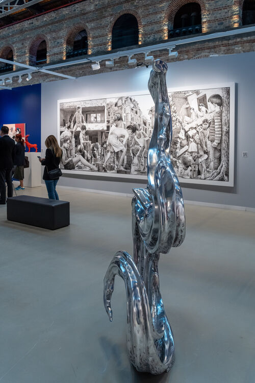 Perhaps the priciest works at the fair can be found at local stalwart Sevil Dolmacı Art Gallery, where paintings by David Salle and works by Barry X Ball are featured. A gleaming silver sculpture by the latter artist, Purity (2024), is priced at $525,000. “Contemporary Istanbul is very important as an international and sustainable art fair in Turkey,” said founder Sevil Dolmacı, who confirmed to Artsy that the work was attracting “great interest.”