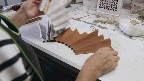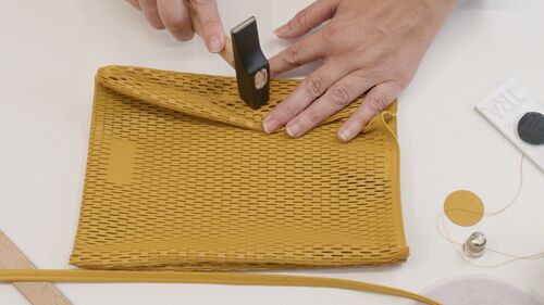 Meanwhile, Hicks—known for her large-scale textile installations—created a leather pouch resembling a bag she herself carried for years. The artist filled the bag with surplus leather and fiber, hoping that people would continue to place new items inside it.