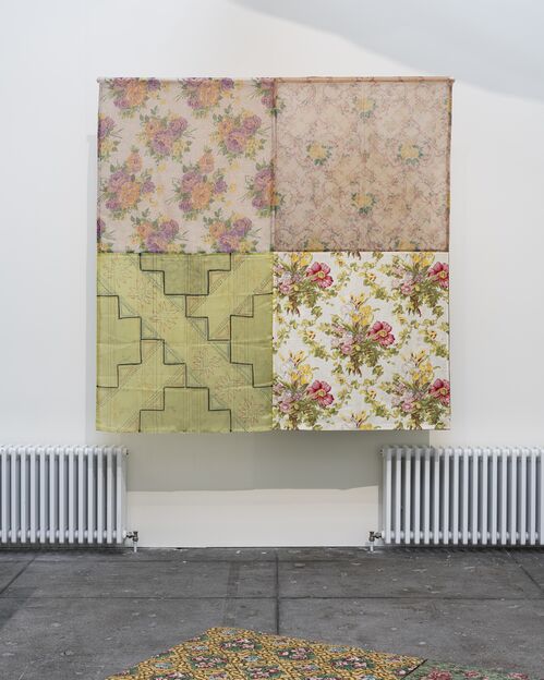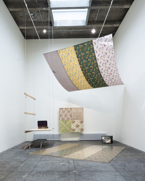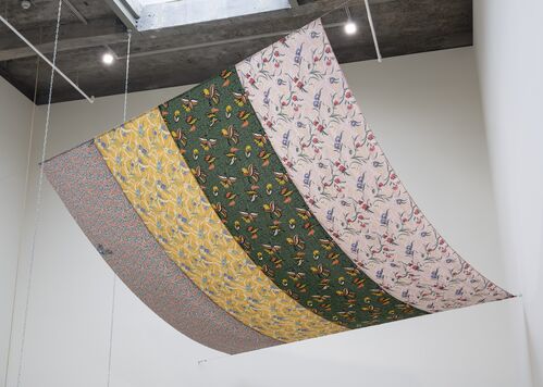 Then, in 1972, she mounted her first solo exhibition at 112 Greene Street, “Four Stages.” A standout piece from this exhibition, Air Space Stage (1972), which is currently on view at CARA, involved four sheets of patterned fabric suspended from the ceiling. Performers interacted spontaneously with the movable pieces, adjusting and manipulating them. In this work, Girouard applied innovative performance techniques to decorative textile work reminiscent of P&D founders Valerie Jaudon and Joyce Kozloff, with an architectural sensibility that echoed her close collaborator Matta-Clark’s explorations of space and structure.