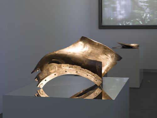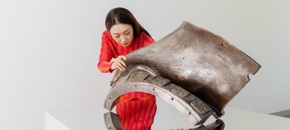 This otherworldly energy comes across in the film, which is made up of landscape drone footage—sometimes shown upside down, inverting sky and earth. These shots are intercut with closeups on the debris and ethereal dance sequences in the desert. Alongside a moody, ominous soundtrack, a voiceover teases out the connections between this landscape and other planets. “Lots of the projects I do are world-building and storytelling, rather than object-making,” Liu said. Nonetheless, the project led to a sculpture series, too: “Debris” (2021), in which the artist cast parts of the rocket refuse in steel. These sculptures were initially classified by the Chinese government as military technology. After three years of negotiations, they were finally able to leave the country, and are on view at the Benton Museum alongside The White Stone.