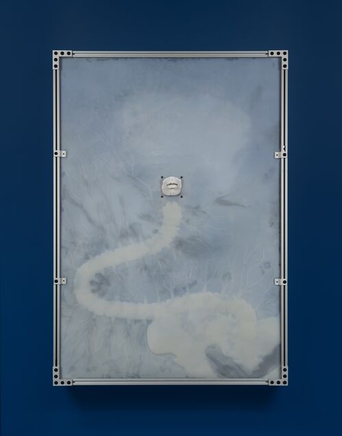 A pair of lips, pouting, is lightly dusted in a layer of freezing ice crystals, floating in the middle of a framed “canvas” of silicon. Evoking the misty cloud of exhaled breath on a cold morning, this cast bronze piece, entitled The Mothership (2023), doesn’t just look frozen, it is frozen. “I want it to be not just visually cold, but physically freezing. So I made a sculpture with a cooling mechanism to generate a layer of frost,” said artist Xin Liu, who cast the sculpture using her own mouth.