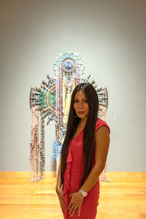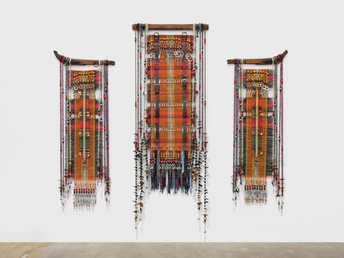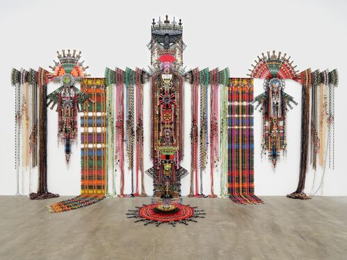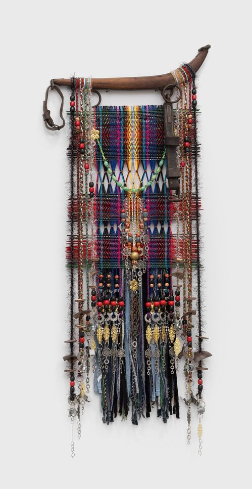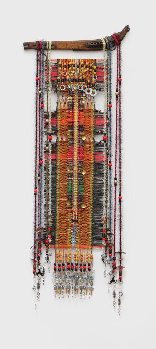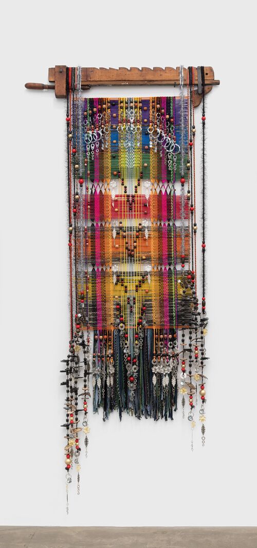 On view until December 21st, the exhibition comes at a significant moment in Samat’s career, following her presentation at the Biennale of Sydney in March and setting the stage for her anticipated solo exhibition at New York’s Museum of Arts and Design next year. The new show is filled with the fruits of her trips to the junkyard—and to garage sales, dollar stores, and the like. Objects including garden rakes, rattan sticks, bejeweled masks, plastic swords, beads, and belts are intricately woven into textiles that function as her base, or as she puts it, her “white canvas.” In fact, these foundational materials aren’t white at all. They’re pua kumbu—multicolored, patterned ceremonial textiles created by the Iban people of Malaysia. After Samat’s meticulous ornamentation process, the resulting works are kaleidoscopic, totemic altars that often drape and trail onto the floor.