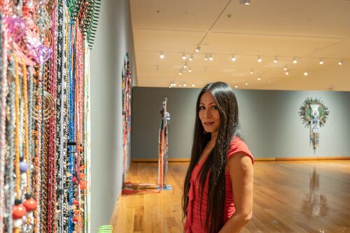 Much of Samat’s work honors the love she holds for her family. The centerpiece of “The Origins of Savage Beauty” is Never Walk in Anyone’s Shadow #2 (2024), a handwoven tapestry ornamented with her salvage finds and dressed with metal links, beads, and even toy army figures dedicated to her deceased relatives. In particular, the middle section memorializes her older brother, who passed away from lung cancer 18 months ago. Among various metal and plastic materials, a “no smoking” sign embedded into the work nods to his illness. “But we’re not going to talk about a sad part of it,” Samat said. She prefers to celebrate the impact that her family has had on her practice: “They are the ones who actually push me to go further and to pursue my career.”