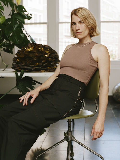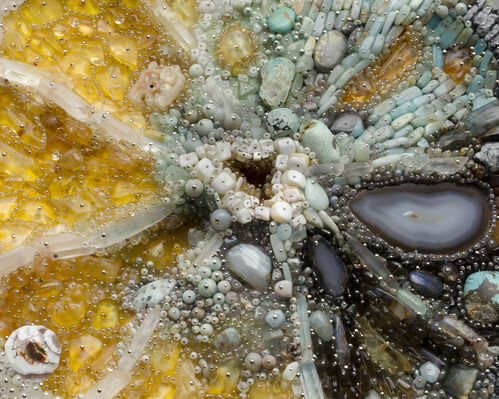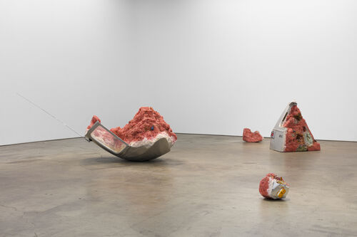 One standout example is Bad Melon (2020), which resembles moldering pieces of watermelon made from glass beads and gemstones, such as quartz and rhodonite, among other materials. The rind is made from a disposed Airstream trailer. Like many of her sculptures, Bad Melon combines precious objects with salvaged materials, emphasizing contradictions between decay and decadence.