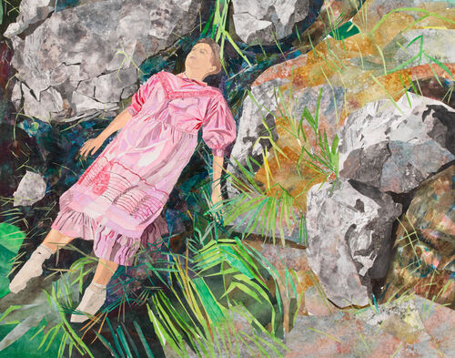 Berrío’s complex figurative scenes portray a range of subjects, from frenetic crowds to introspective portraits. Her collages are often inspired by fantasy or folklore. One work at her solo exhibition at Victoria Miro, The Spectators (2024), features a crowd standing behind a figure in a bright red coat wearing a cat face mask. Her subjects, primarily women or children, are frequently portrayed in uncanny, strange, or exciting situations. Oftentimes, these works address political and social struggles, such as deportation detention centers in the U.S. or instability in her home country.