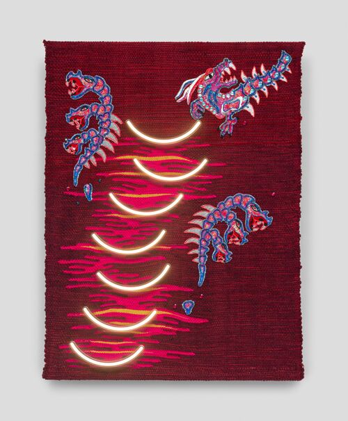 Her response to these newly encountered stories is a set of large wall-based sculptures. “I really wanted to preserve the sensation of revelation in these pieces,” the artist said. “I arrived at the loom with the same wonder I felt when I first discovered the myths and urban legends of my ancestors—a gift I felt compelled to pass on, just as it was passed down to me.”