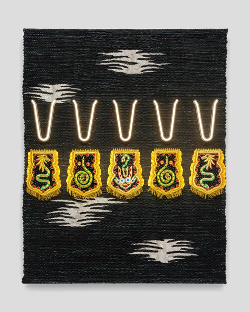 In the weaving Ekeko (2024), white LED strips illuminate an altar of offerings: little bags of sugar, rice, and candy as well as rolls of banknotes and figurines cast in resin that sit on shelves affixed to the fabric. Across the Andean area of Bolivia, every year, on January 24th, similar objects are taken to be blessed by local shamans in a ceremony known as La Fiesta de Alasitas. “During the celebration, the entire city of La Paz is filled with thousands of miniatures, signifiers of what an individual wants to enter their lives in the coming months,” said Almaraz Murillo. “I grew up admiring this energy of abundance and I dreamed of one day honoring it.”