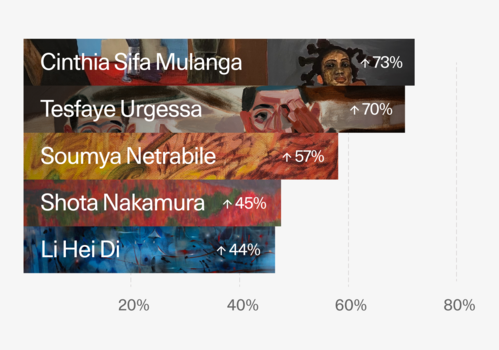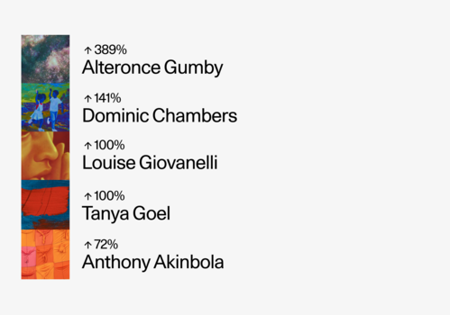 On October 21st, we launched the seventh edition of The Artsy Vanguard, which features 10 of the most promising artists working today across various geographies and mediums. Since Artsy started the Vanguard in 2018, many of its alumni have gone on to become leading names in contemporary art. To mark the occasion of this year’s Vanguard, we are featuring two data spotlights. The first looks at trending artists from last year’s Vanguard, while the second offers a glimpse into the growth in commercial interest in works by artists featured in Vanguard from 2020 to 2022.