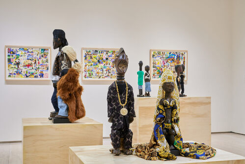 The exhibition was developed through an innovative curatorial process, with artists Jeffrey Gibson, Vik Muniz, Mickalene Thomas, and Fred Tomaselli selecting many of the names included. In addition, the museum ran an open call, which received responses from over 4,000 hopefuls. The resulting presentation is a diverse, visually exciting melting pot—just like Brooklyn itself. Overlapping themes emerge, such as the intertwined nature of identity, memory, and place, as well as the power of art to create community. Included in the standout pieces is Artsy Vanguard 2025 artist Melissa Joseph’s felt portrait of her niece, Olive, giving her father an alfresco haircut during the pandemic. With remarkable skill, Joseph has meticulously recreated the image from a selfie, translating even the minute details of her family’s facial expressions with her signature dry-felted fibers.