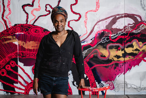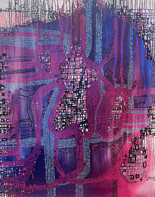 Though he only picked up painting during the COVID-19 pandemic, Brisbane’s Jan Murphy Gallery had already mounted a buzzy solo show for the artist in fall 2022. His energetic paintings are characterized by splashes of purples, pinks, and oranges, alongside frenetic mark-making. These works often incorporate symbols and iconography that honor his Aṉangu heritage. “Because of the two knowledges I possess; ancient and contemporary, culture is purely about connection. That’s my story at the moment. That’s where I sit,” the artist said. Some works, such as 564-24AS (2024), feature long lines of cursive-like text that curl across the canvases.