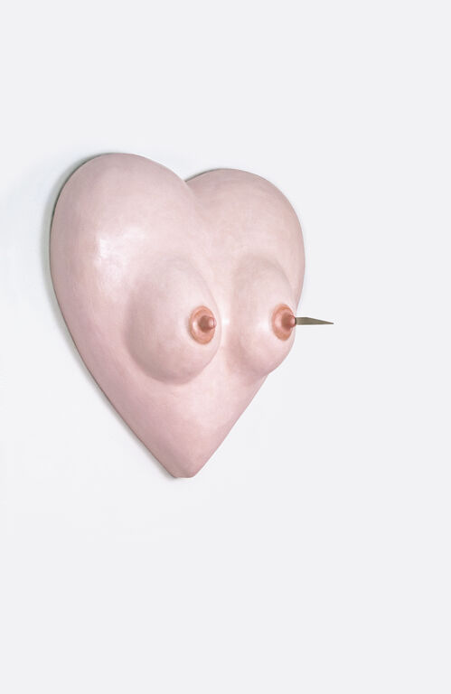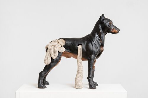 Jürgenssen often placed household items in compositions that have an unnerving impact. In Caught Happiness (1982), she utilizes cages and aggressive cogs, all painted gold; Untitled (Dog) (1972) is a small sculpture showing soft guts spilling from a ceramic hound, as though its dark inner world is falling from its neatly packed external form. Meanwhile, Untitled (Zipfel) (1967) presents a mass of soft textiles taking on a gut-like shape, squeezed tightly into a bell jar. Her pieces address the long-term impact of fascist ideology through the roles and restrictions placed on Austrian women, in the home and beyond. The domestic realm of the family, in Jürgenssen’s work, is shown to be tainted.