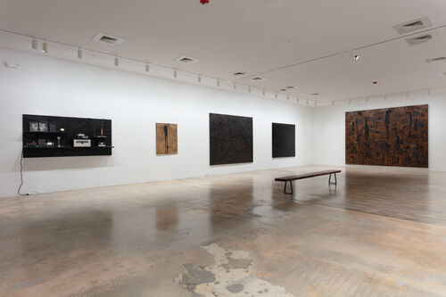 The Rubells also occasionally collect en masse. Not only did they just send the Guggenheim numerous works for Rashid Johnson’s forthcoming retrospective—but they’ve also transformed their museum’s second gallery from a group show to a spotlight on the artist. One mystifying work of black soap, wax, and paint on red oak retains its longtime post, alongside scores of Johnson’s other looming wall-mounted assemblages, many featuring record and book collections. “I was amazed that we could put together such a lovely gallery,” Mera reflected.