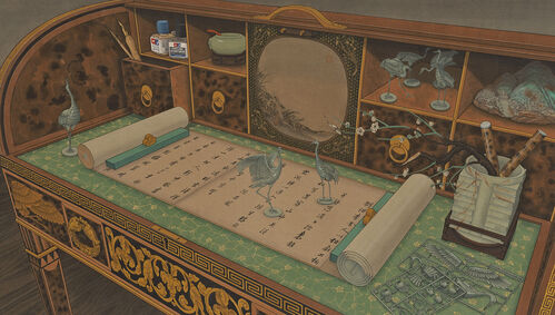 In Beijing-born artist Wang He’s Secretaire of Lin Hejing (2024), the past and present are directly contrasted. The work portrays the imagined desk of the Song Dynasty poet Lin Hejing, who was known for his love of plum trees and raising cranes. The desk displays a huge array of ancient artifacts—such as calligraphy and jade brush holders—with modern objects, including modelmaking paint and DIY plastic cranes. This scene creates a harmonious image where antiquity and modernity coexist. Wang’s painting reflects his own experience working with the past while living in the present, as he spent more than 10 years restoring ancient paintings and calligraphy at the Palace Museum in Beijing.