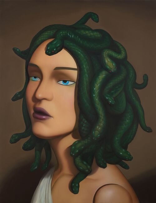 Sun Yitian’s large acrylic portrait of Medusa (2023) takes a different approach to depicting shared history with a personal spin. With her smooth skin and the apparently fake snakes around her head, the titular subject resembles a plastic Barbie doll, a commodified version of the Greek mythological figure. This reference to commerce is intentional: The inspiration for the painting stems from the artist’s childhood memory of seeing the snake-headed figure as the Versace logo on a backpack. While the original mythological figure turned her onlookers into stone with her gaze, Sun’s Medusa projects her own alienated gaze back onto her viewers, similarly subjected to today’s commodity culture and consumer society. It makes a striking contrast with the violent and confrontational scream of Caravaggio’s beheaded Medusa (1597).