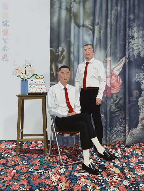 Two millennial Chinese men stare the viewer straight in the eye in Chen Fei’s life-size portrait entitled Friendship (2023). Based on the artist and his friend, both men have almost identical buzzcuts and wear the same attire, with a red tie and the word “comrade” engraved on each of their tie slides. Their modern haircuts and formal clothing seem to clash: They could either be two “bros” or two members of the same political party. The painting hints at China’s charged political past, combining Chen’s personal life with his identity as a professional Chinese painter.