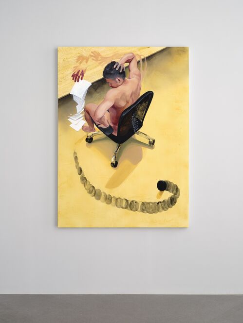 For example, millennial figurative painter Wang Xiaoqu paints scenes that look at our current collective alienated state of mind, based on her experience living in modern Chinese cities such as Chongqing. In Chaos (2024), she shows a naked man sitting on an office chair as he drops pieces of paper onto the floor: an absurd yet somehow relatable scene. Wang explained that she’s hoping to capture the feelings of disconnection and weightlessness associated with living in a complex and turbulent reality in her work: “In the process of globalization, China is trying its best to shorten the distance with the developed world,” she said in an interview with Artsy. “It’s like chasing a time difference that is difficult to bridge, and individuals are caught in the huge gap caused by it.” The man sits alone as he experiences his inner turmoil engulfed in a sea of yellow, reflecting the turbulence and alienation of living in many cities today among the masses.