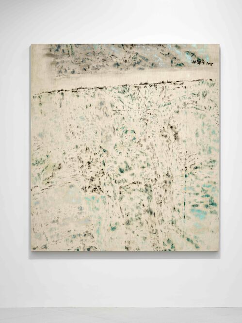“A Cloud in Trousers” also presents artists who are directly breaking away from painting’s ingrained traditions, both Chinese and Western. For example, experimental artist Xie Nanxing rethinks the conventions around depictions of nature in his “Postcard” series. In Postcard No. 5 (2015), Xie layers two canvases and allows paint from the upper canvas to seep through to the lower one, leaving dotted traces of painting. The remaining specks of earthy greens and browns blotted across the canvas hint at a natural landscape through the traces of a faded image. “These dust particles are remnants of the original finished painting, revealing it and liberating it at the same time,” Xie told Artsy in an interview. Xie slowly removes each of his brushstrokes from the canvas and instead relies purely on chance to produce Postcard No. 5.