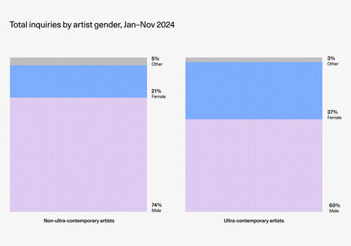 This report draws upon an analysis of primary market data from Artsy’s online marketplace from the period of January 1–November 11, 2024. Our examination centers on inquiries on artworks, which serve as a proxy for sales and market interest. The inquiry data we examined includes both the volume of inquiries placed on artists’ works on Artsy in 2024, as well as the year-over-year growth from 2023 to 2024 where stated.