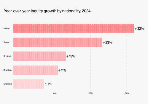 Artsy’s global marketplace hosts galleries from more than 100 countries and attracts collectors from more than 190. This is reflected in the composition of artists, too. In this chart, we look at the artist nationalities that have received the sharpest rises in year-over-year inquiries overall.
