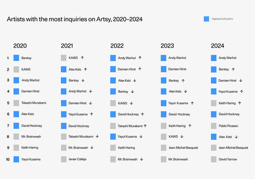 The chart shows the top 10 artists over the past five years and highlights the names that appear on the list all five years. While 11 names appear on multiple years’ lists, six appear every year: Andy Warhol, Banksy, Damien Hirst, Yayoi Kusama, David Hockney, and Alex Katz. This consistency in demand is an indicator of the artists with relatively stable markets, even across moments of economic uncertainty.