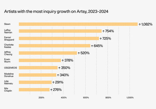 This section looks at the artists who received the strongest year-over-year surges in artwork inquiries on Artsy in 2024. Inquiries on Artsy are messages from potential buyers to galleries about artworks they are interested in purchasing. As such, they are key barometers of commercial demand.