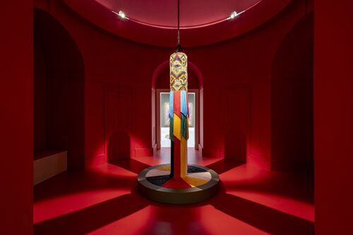 The first Native American artist to represent the U.S. in a solo presentation at the Venice Biennale, Jeffrey Gibson made sure his solo pavilion had a critical edge. His installation, an explosion of color and geometric forms, challenged restrictive colonial narratives and celebrated Indigenous and queer identities. The show was named by Artsy as one of the 10 best pavilions at the 2024 biennale, featuring sculptures adorned with bright tassels and colorful, text-laden paintings.