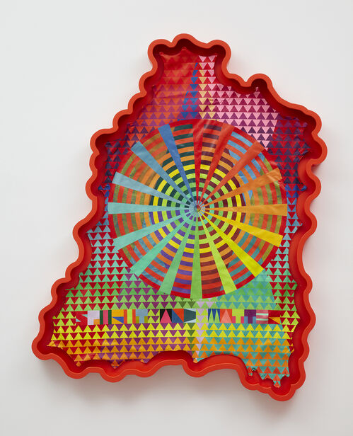 All the while, the London artist’s presence has been felt worldwide, from inclusion in group shows at El Espacio 23 in Miami and James Fuentes in New York to his colorful installations at the Glastonbury Festival in England. Perhaps most notably, in the Parcours sector of Art Basel in June, Barrington unveiled Come Home (2024), an architectural installation inside the city’s Tropical Zone supermarket—a space serving the local Afro and Latin American communities. This structure, built from traditional Caribbean materials like burlap and timber, featured new abstract paintings from his “Hibiscus” series.
