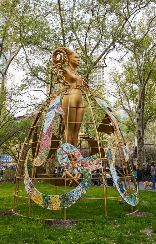Originally installed in New York’s Madison Square Park, where it stood in the shadow of the Manhattan Appellate Courthouse, Witness symbolizes women’s strength in the context of a legal system that has historically failed us. The towering metallic figure’s coiled braids evoke the ram’s horn motif—a symbol of power—found in the courthouse’s architecture. Its lace jabot honors Ruth Bader Ginsburg, who often wore decorative collars with her judicial robes.