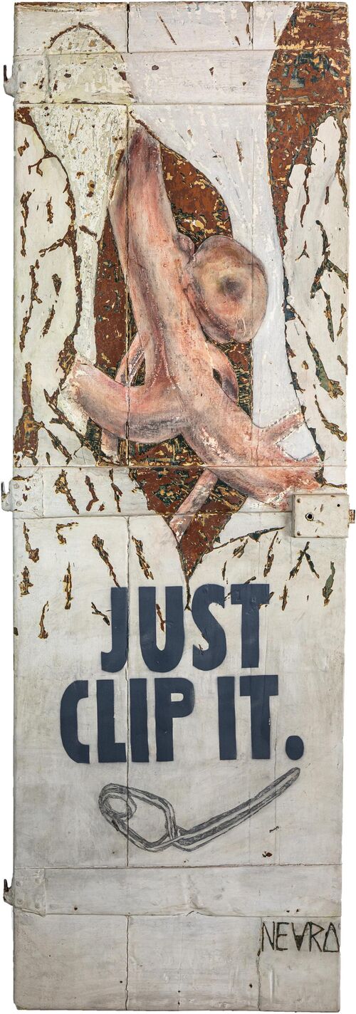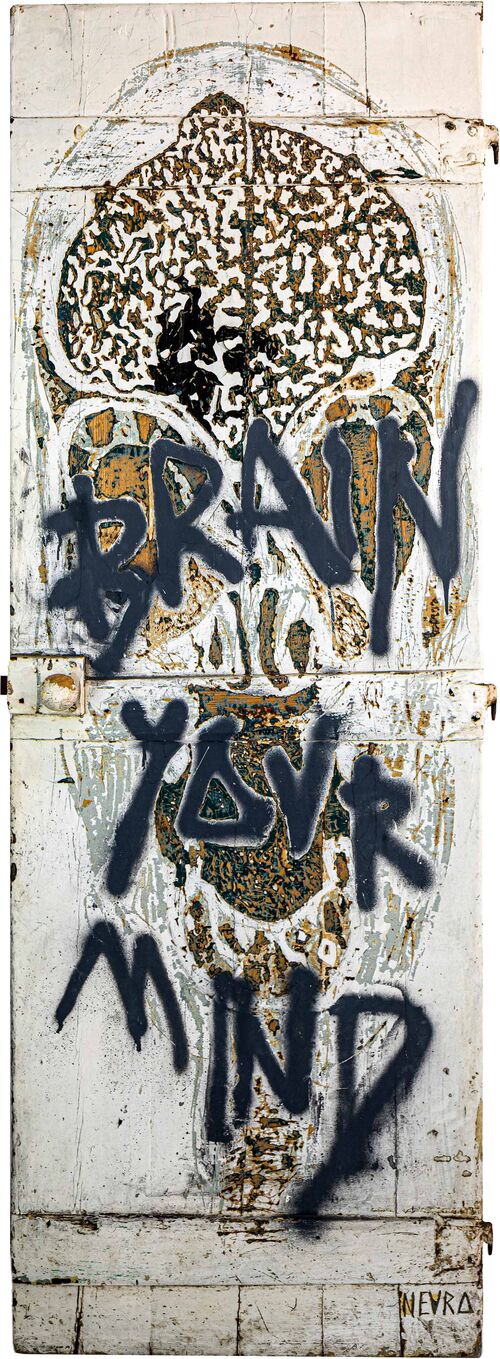 While artist NEVRO remains pseudonymous, his CV claims that he has a PhD in neurosurgery. This fascination with the human brain makes its way into his artworks, painted on unconventional canvases such as old doors, skateboards, and toys. The artist, whose name seems to cryptically reference Nevro Corp., a global medical device company that specializes in therapies for chronic pain management, adds graffiti-like tags featuring brains and provocative phrases. He carves into the wood with tools from the neurosurgical theater—scalpel blades, rongeurs, and drills—before painting his provocative images of brains or medical equipment.