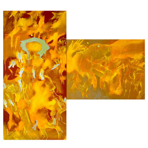 Natalia López de la Oliva sees her explosive, brightly colored abstract paintings as introspective tools. In a recent conversation with Overstandard, she described her approach: “I use painting as a protest, a destabilizer of tradition, a magnifying power. It is powerful because it creates a space dedicated to the inner world.” Her diptych No quería despertar a los que están durmiendo (2024) captures this intent with its dynamic swirls of fiery oranges and yellows, disrupting conventional forms. This standout work anchors her solo exhibition “Lo divino es el impulso de la lengua” at Herrero de Tejada in Madrid.