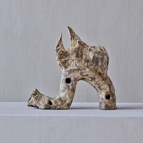 Ferlov Mancoba’s roughly finished bronze sculptures, such as Mask and Figure (1977), draw on the aesthetics of African masks and totems, showcasing the profound impact of African iconography on European modernism. Meanwhile, Payne’s glazed stoneware sculptures, inspired by Indian folklore, address themes of transformation and animism through similarly biomorphic shapes.