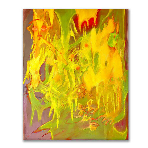 López de la Oliva’s paintings share a fluorescent palette of neon green and yellow oil paints. Many of these works are titled with irreverent phrases. For instance, Pffffffwrs no voy a abrir la boca (2024), a frenetic bright green painting, translates to “Pffffffwrs I’m not going to open my mouth,” and No vas a impresionar a nadie (2024), which appears to depict a figure engulfed in flames, translates to “You’re not going to impress anyone.”