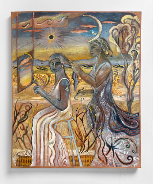 One standout painting in the exhibition is Somatic Mirage (2024), depicting a woman braiding another’s hair in front of a floating mirror set against a stylized, mystical landscape with a black sun glowing over the horizon. Other paintings—including Shrine by the Sea (2024), which portrays an ethereal coastal temple surrounded by alternating landscapes depicting both daylight and night—draw inspiration from her travels across the Balearic Islands in Spain.