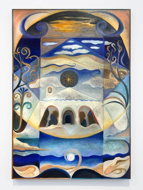 Margaret R. Thompson often paints directly under the expansive New Mexican skies. Originally from Washington, D.C., she draws inspiration from the Southwest’s mountainous skylines and vast desert vistas in her surreal and uncanny landscapes populated by goddess-like figures. As she paints outside, she incorporates organic materials like wax, sand, and soil, adding rich, natural textures to her work. These paintings comprise her first solo show, “Sky Mirror,” which is being mounted by Red Arrow Gallery.