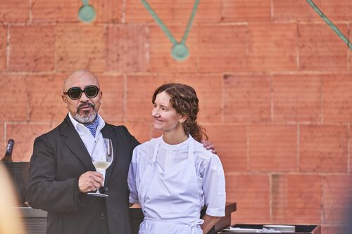 This was evident from the start with Barba’s Open Field Poem (2023), a kinetic installation at the main building’s entryway outdoors, just past rows of 100-year-old olive trees. Using heliostats (devices that track the sun and reflect its light on a specific target) and colored glass, the piece casts shifting red and orange light onto engraved stanzas in paving stones. “She designed an incredible orchestral performance conducted by the sun,” Horn said. “Atmospheric conditions dictate how you interact with the work, making it a beautiful way to engage with concepts fundamental to winemaking, like ecosystems, time, and place.”