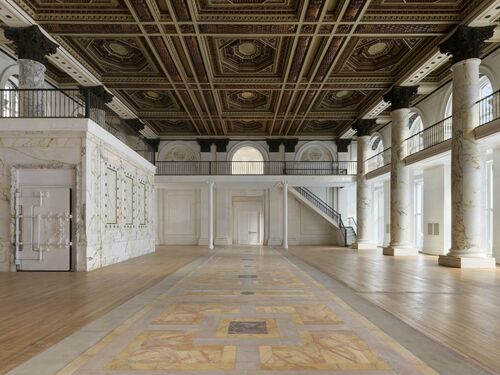 Housed in the historic Clock Tower Building at 46 Lafayette Street, the new gallery occupies a 20,000-square-foot space. The restoration preserves the building’s original grandeur, including its Beaux-Arts bank hall with its ornate, coffered, 29-foot-high ceilings, grand staircases, and arched windows, providing a fitting stage for Cave’s large-scale works. Although Cave’s exhibition marks the official opening, the gallery has presented several large-scale works throughout 2024.